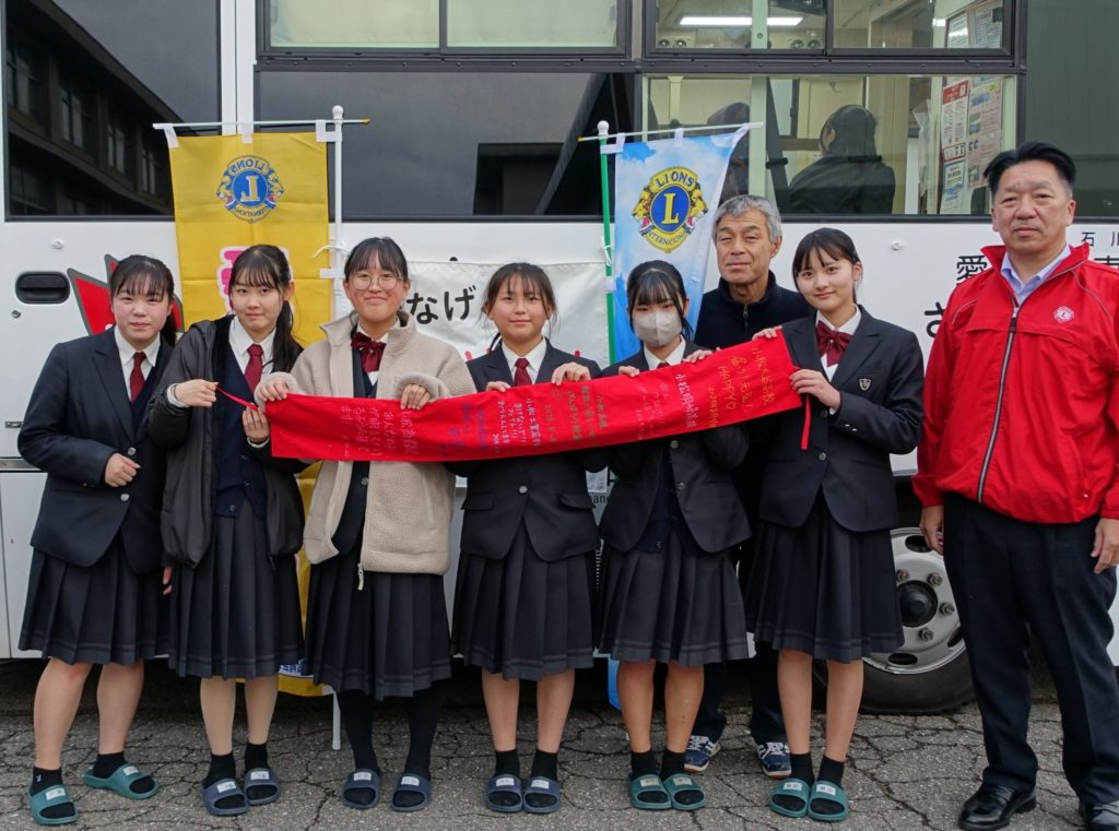 8月からスタートした事業もこの日最後の小松商業高校へ無事にリレーすることができました。たすきには各高校の復興への思いを込めたメッセージが書かれており、今後能登地区での献血が再開された際に会場に掲げられる予定です。